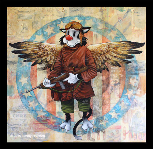 The character of Ace, represents American grit, fearlessness and courage. The theme is a new reflection on the strength of the fighting men of the WWII era. Although he is of no great size, he makes up for it with courage. His feathers are not white and clean, as an angels’, they are dirty and sooty, like those of a bird of prey.