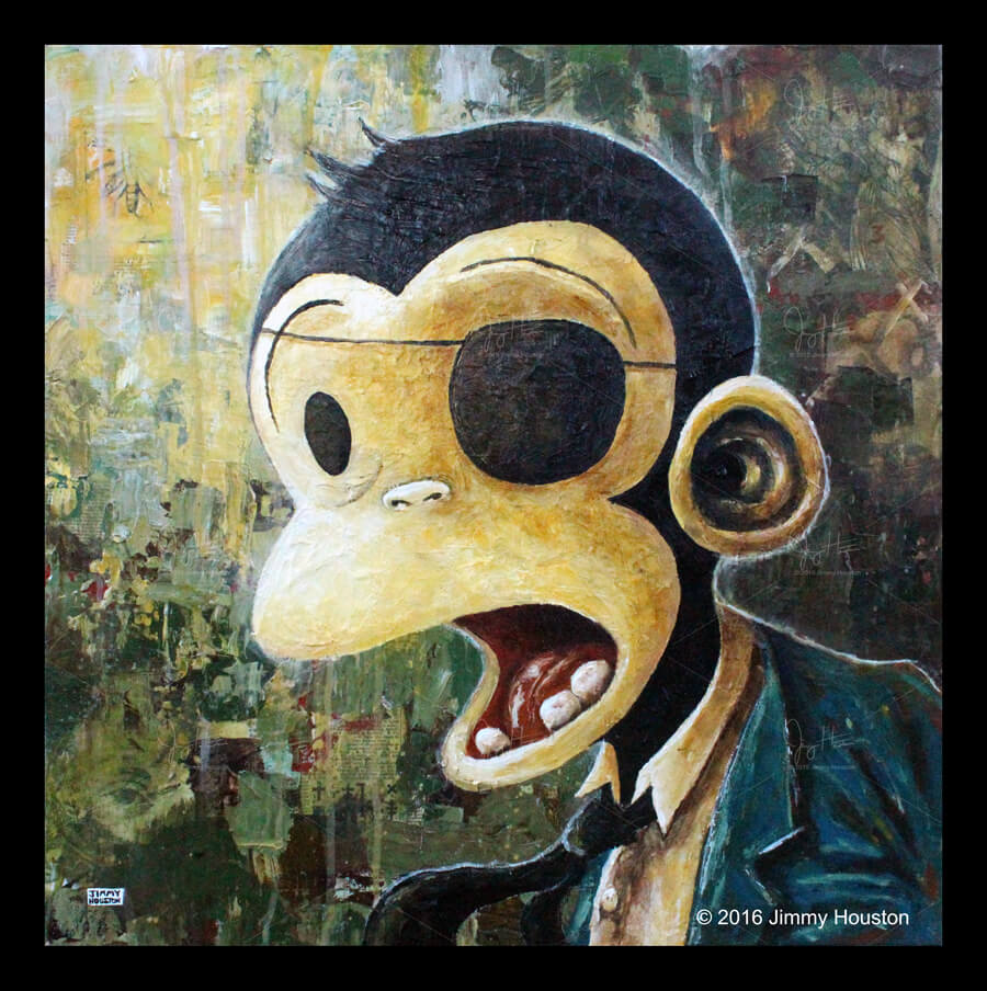 Rig, caught dumbstruck in the moment of revelation. An alarming epiphany strikes him in warm light. The heavier tones, the impasto marks of the pallet knife and the buried paper images illustrate his jumbled thoughts. They are the heaps of information that crowd the mind.