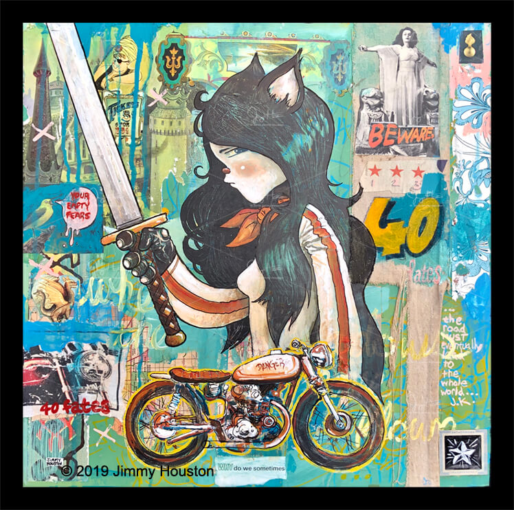 Shirley Danger is a quiet, yet powerful force among the ranks of the all female motorcycle gang, the 40 Fates. In her mind, fears are a curse that must be cut down by any means necessary. She emanates strength, independence and tenacity. Mystical pigments of blue and green invite us to join her. Living upon the razor’s edge, she will forge a path ahead. As with her fellow sisters in the 40 Fates, this path is not for the faint nor the coward.