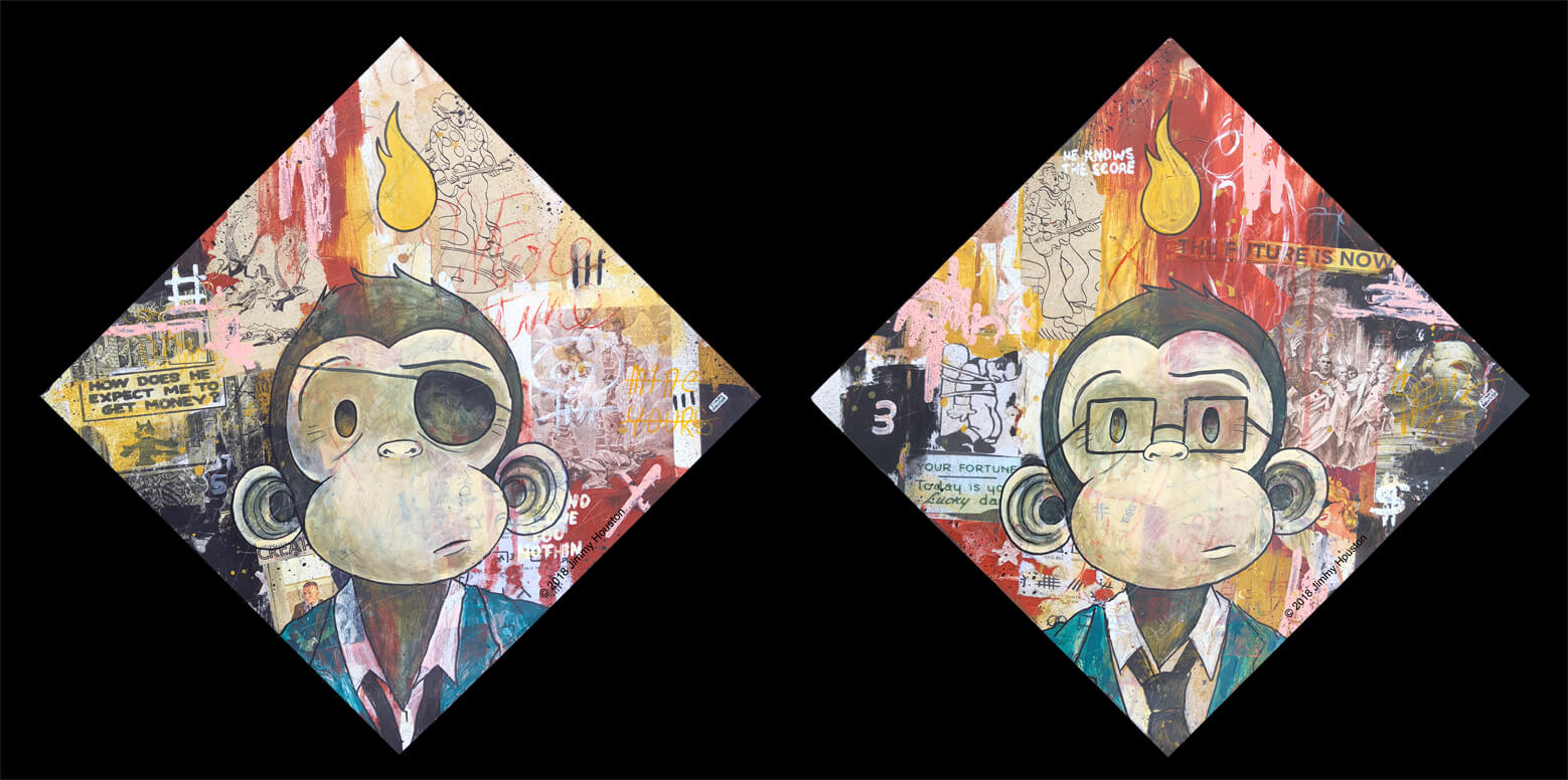 The twin brothers, Rig and Rex are transfixed in a moment of discovery. The diptych is filled with a myriad of worn and weathered thoughts. Ambition, hopes, distractions and luck: angels, fears and muses all dance, layered in the background. A single spirit flame dances above their heads.
