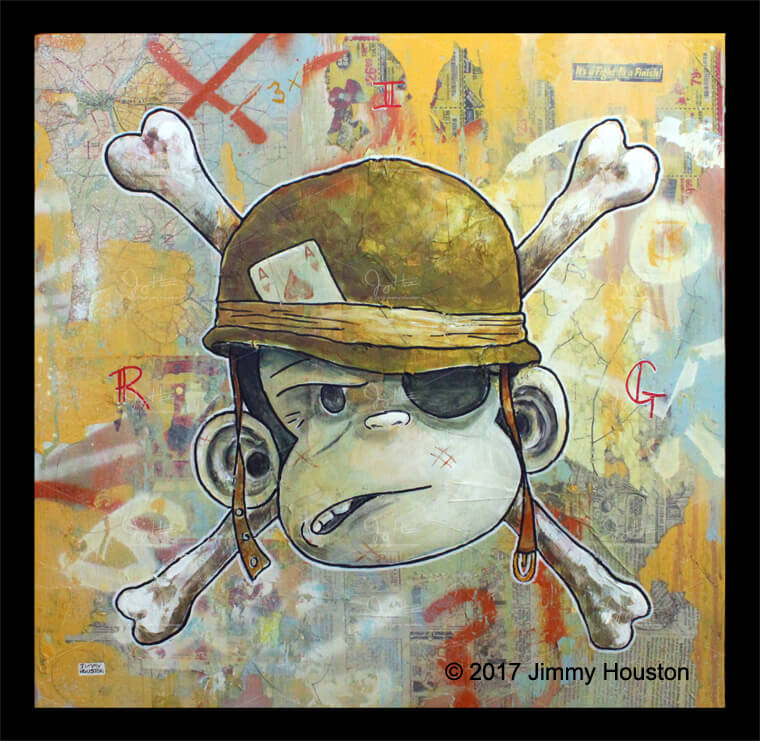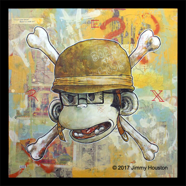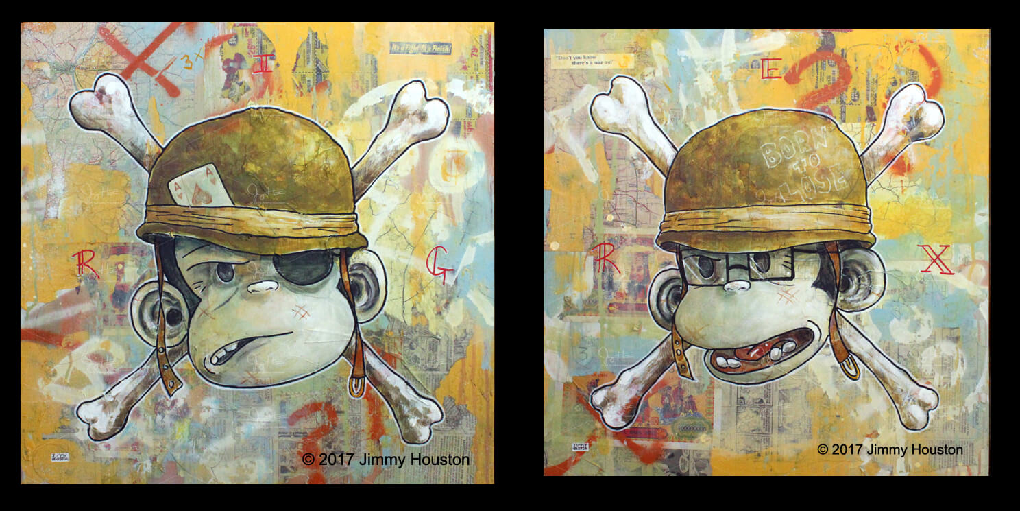 The boys are on the front lines, helmets on and ready to fight. This diptych of Rig and Rex pays homage to the American soldier. It also comments on the idea of fighting for what one believes in. Everyone has something they are battling against, fighting for or striving to achieve.