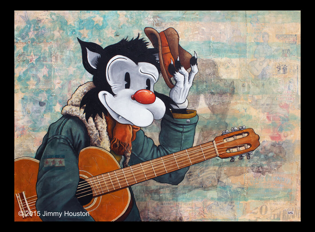 To the left sits Bob Dylan, like a devil on the cat’s shoulder. A tattoo sparrow, sits deep in the background, also singing a song of freedom.