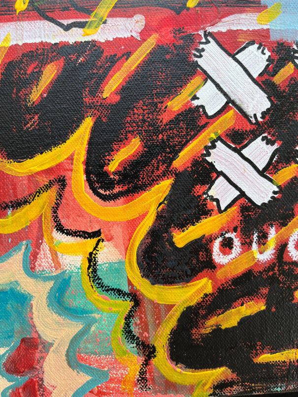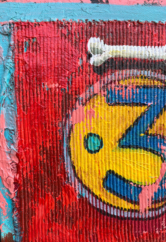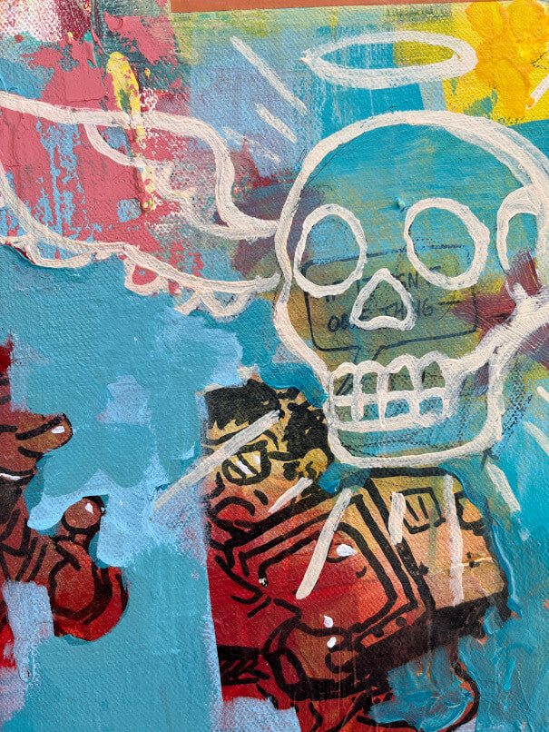 My reoccurring number three appears as a grounding yellow blue icon. The bone and the “haloed” skull are the memento mori. It’s a reminder that life is much more real when viewed beyond the performance; much more real with all of its surprises, textures, layers and hues.