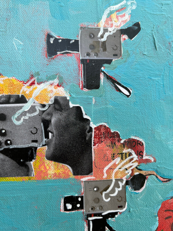 Winged film cameras hover close to the Greta Garbo cutout. They are objective observers, “recording angels” representing the unaffected truth. Ever wanting to present a “good face,” this piece continues the dialogue that’s found throughout the Cinéma Vérité series.
