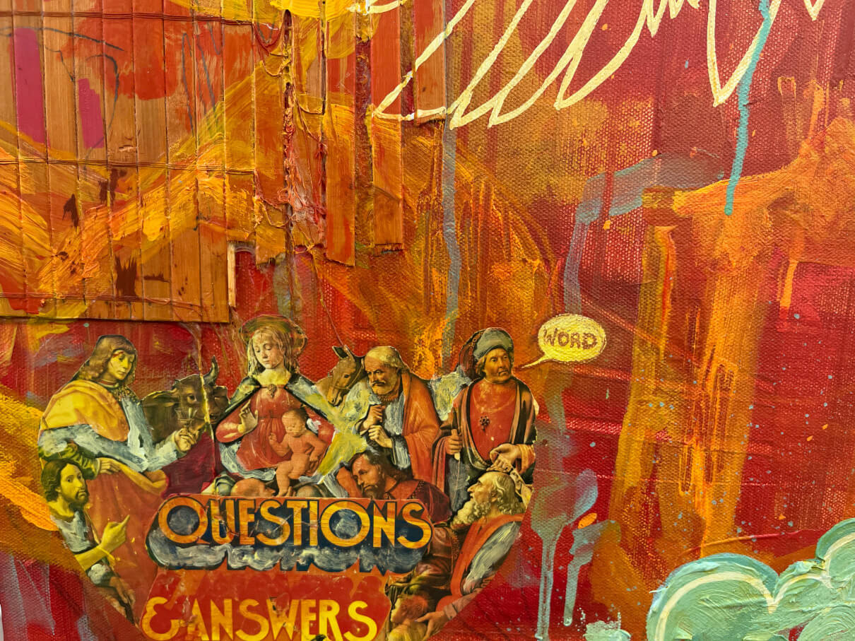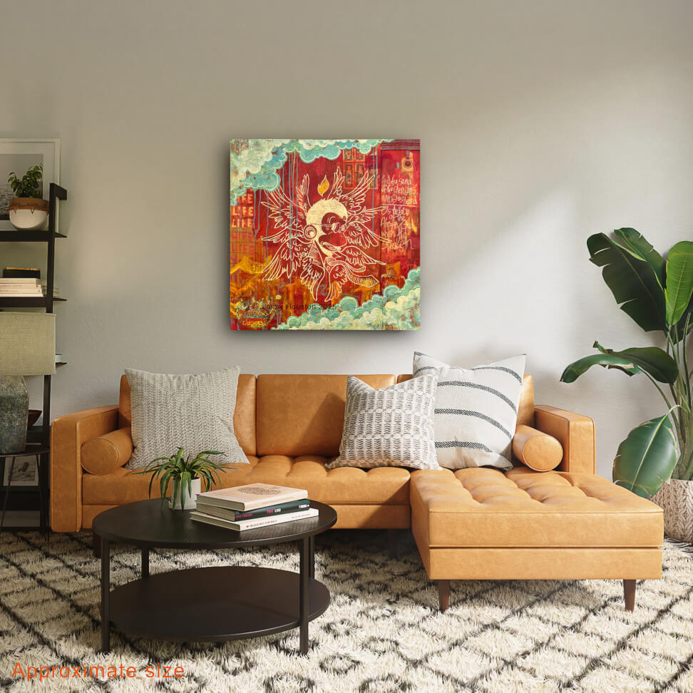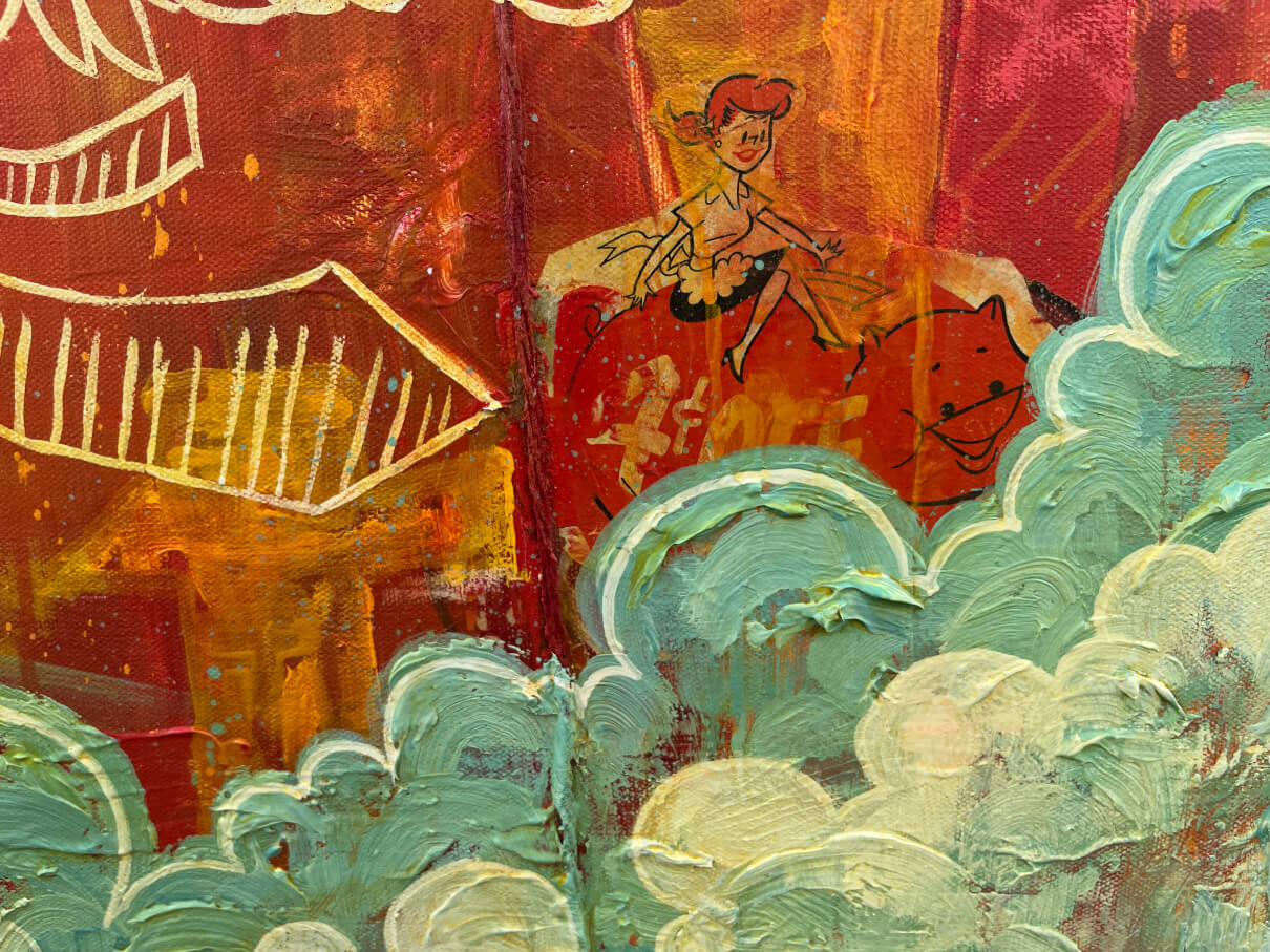 One of my signature monkey brothers, Rex has gone celestial—now a multi-winged cherubim, straight out of a biblical vision. Surreal, wild, and floating through a sky of electric blue green clouds, he pops against a bold red background, with thick textures and layered materials doing some heavy lifting.