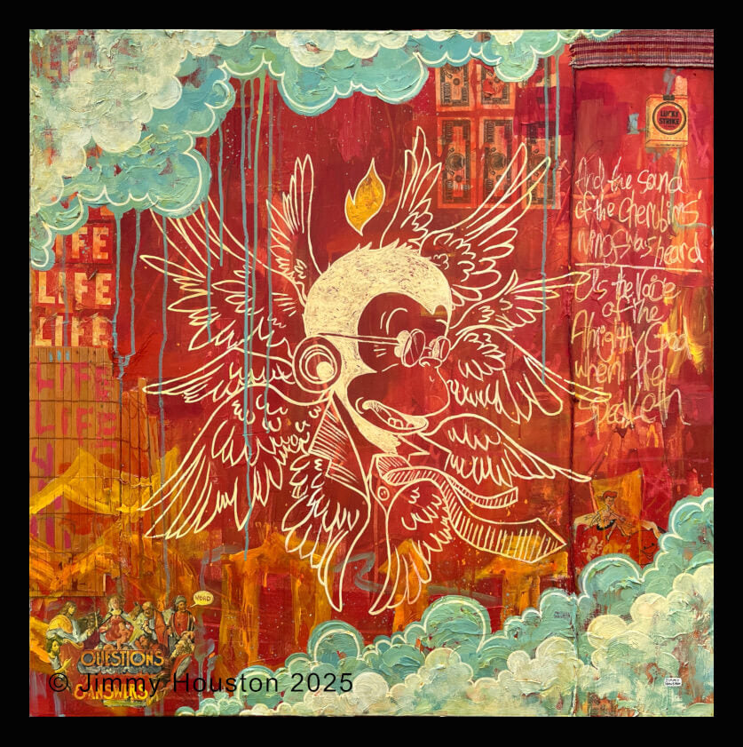Eternal echoes in a comic book speech bubble. It’s sacred noise from a cartoon prophet with too many wings. Those white outlines— like when someone’s invisible or strumming the edge of the afterlife.