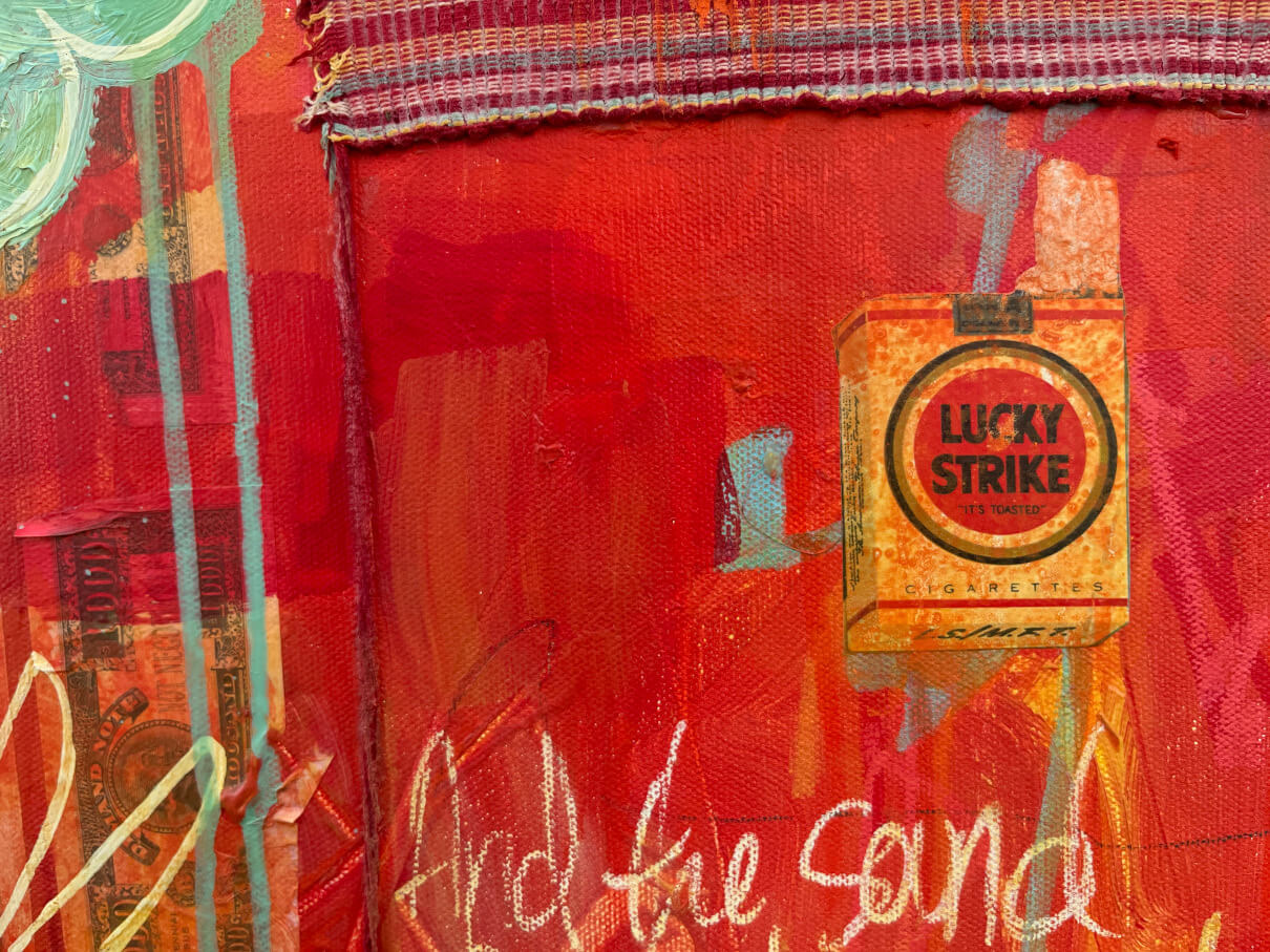 Acrylic, oil stick, paper, fabric, wooden slatted table mat and graphite on canvas