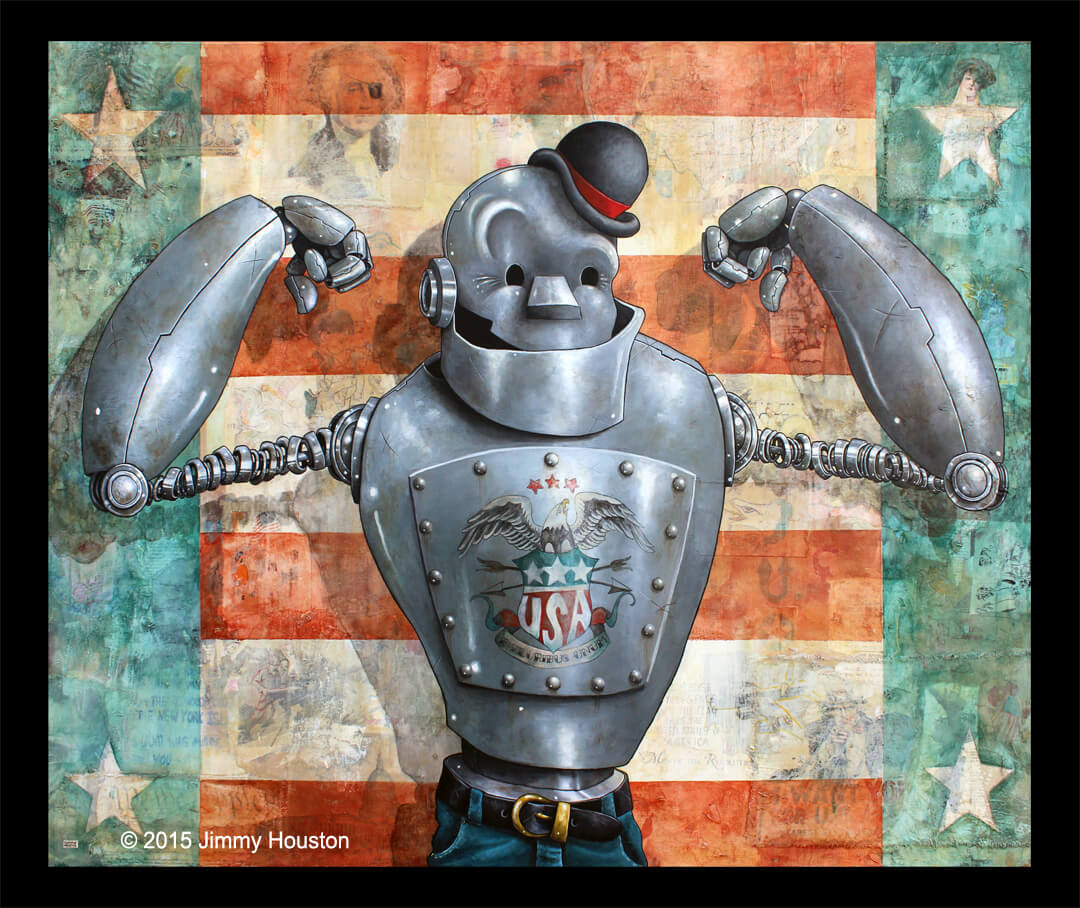 This bold piece demands attention. Like old Glory itself this tin-man, Murphy, proudly displays his might. His rusted rivets and vintage patriotic tattoo echo the nearly forgotten determination and strength of the American people. Forged from the ideals of the greatest generation, Stars and Stripes is industry, innovation and fortitude.